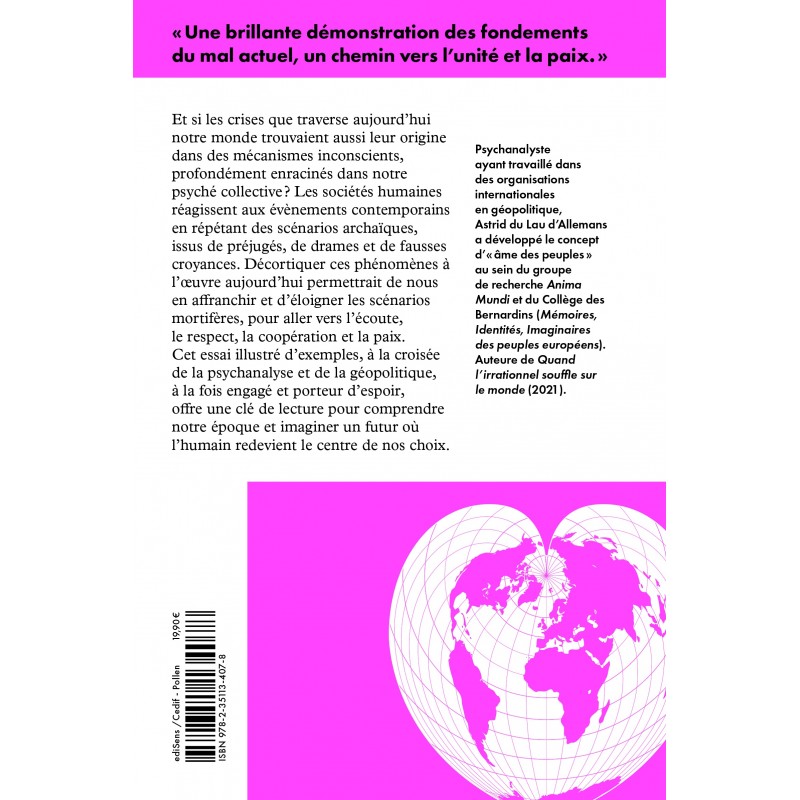 Psychanalyste, Astrid du Lau d’Allemans a créé le groupe de recherche Anima Mundi au Collège des Bernardins (2013-2015) pour étudier l’inconscient collectif des peuples et son influence dans les relations internationales. Elle a développé une approche spécifique des problèmes géopolitiques et sociétaux et avancé l’idée d’Âme des peuples. Elle est aussi l’auteure de Quand l’irrationnel souffle sur le monde, 2021.